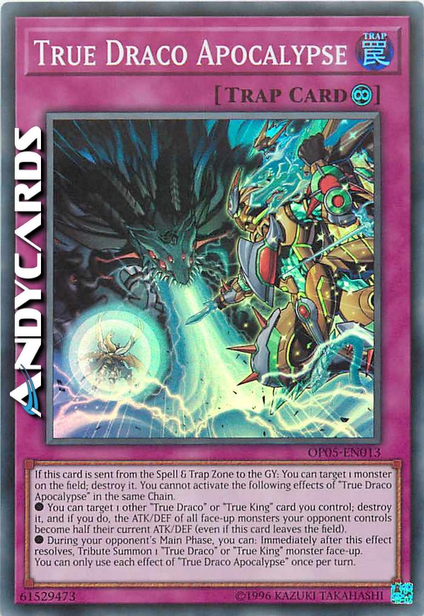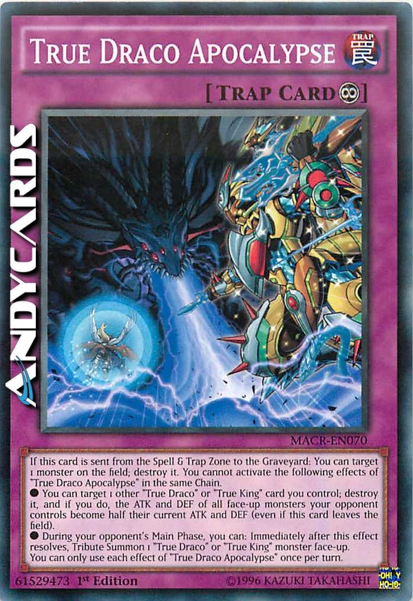 If this card is sent from the Spell & Trap Zone to the Graveyard: You can target 1 monster on the field; destroy it. You cannot activate the following effects of "True Draco Apocalypse" in the same Chain. - You can target 1 other "True Draco" or "True King" card you control; destroy it, and if you do, the ATK and DEF of all face-up monsters your opponent controls become half their current ATK and DEF (even if this card leaves the field). - During your opponent's Main Phase, you can: Immediately after this effect resolves, Tribute Summon 1 "True Draco" or "True King" monster face-up. You can only use each effect of "True Draco Apocalypse" once per turn.