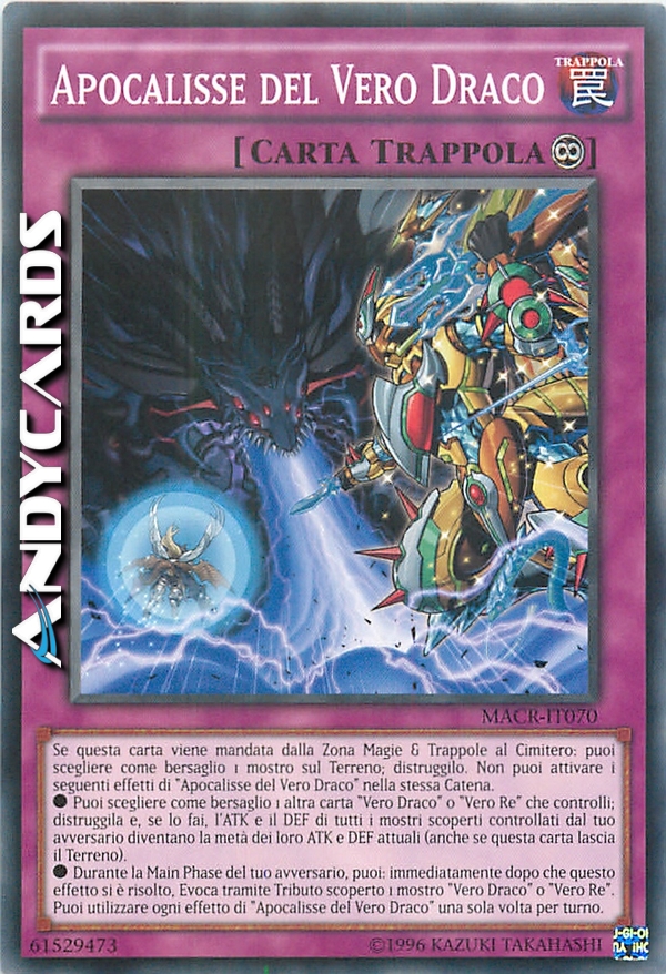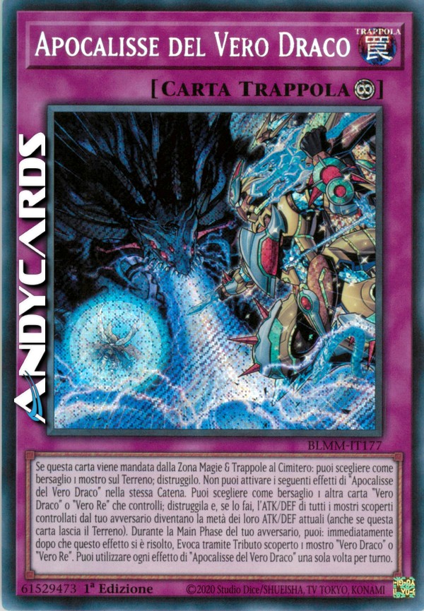 Se questa carta viene mandata dalla Zona Magie & Trappole al Cimitero: puoi scegliere come bersaglio 1 mostro sul Terreno; distruggilo. Non puoi attivare i seguenti effetti di "Apocalisse del Vero Draco" nella stessa Catena. - Puoi scegliere come bersaglio 1 altra carta "Vero Draco" o "Vero Re" che controlli; distruggila e, se lo fai, l'ATK/DEF di tutti i mostri scoperti controllati dal tuo avversario diventano la metà dei loro ATK/DEF attuali (anche se questa carta lascia il Terreno). - Durante la Main Phase del tuo avversario, puoi: immediatamente dopo che questo effetto si è risolto, Evoca tramite Tributo scoperto 1 mostro "Vero Draco" o "Vero Re". - Puoi utilizzare ogni effetto di "Apocalisse del Vero Draco" una sola volta per turno.