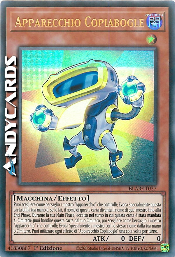 Puoi scegliere come bersaglio 1 mostro "Apparecchio" che controlli; Evoca Specialmente questa carta dalla tua mano e, se lo fai, il nome di questa carta diventa il nome di quel mostro fino alla End Phase. Durante la tua Main Phase, eccetto nel turno in cui questa carta è stata mandata al Cimitero: puoi bandire questa carta dal tuo Cimitero, poi scegliere come bersaglio 1 mostro "Apparecchio" che controlli; Evoca Specialmente 1 mostro con lo stesso nome dalla tua mano o Cimitero. Puoi utilizzare ogni effetto di "Apparecchio Copiabogle" una sola volta per turno.