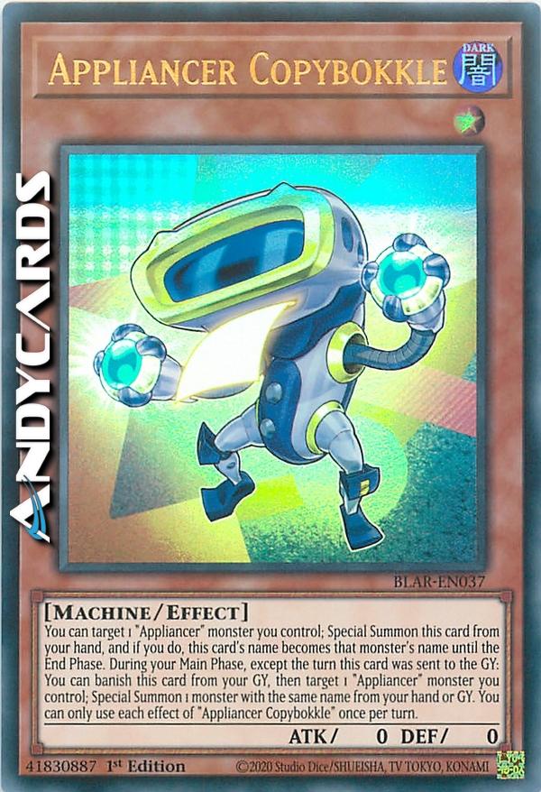You can target 1 "Appliancer" monster you control; Special Summon this card from your hand, and if you do, this card's name becomes that monster's name until the End Phase. During your Main Phase, except the turn this card was sent to the GY: You can banish this card from your GY, then target 1 "Appliancer" monster you control; Special Summon 1 monster with the same name from your hand or GY. You can only use each effect of "Appliancer Copybokkle" once per turn.