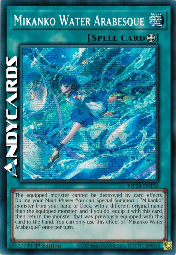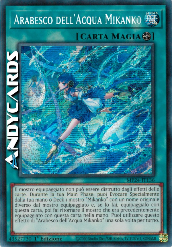 Il mostro equipaggiato non può essere distrutto dagli effetti delle carte. Durante la tua Main Phase: puoi Evocare Specialmente dalla tua mano o Deck 1 mostro "Mikanko" con un nome originale diverso dal mostro equipaggiato e, se lo fai, equipaggialo con questa carta, poi fai ritornare il mostro che era precedentemente equipaggiato con questa carta nella mano. Puoi utilizzare questo effetto di "Arabesco dell'Acqua Mikanko" una sola volta per turno.