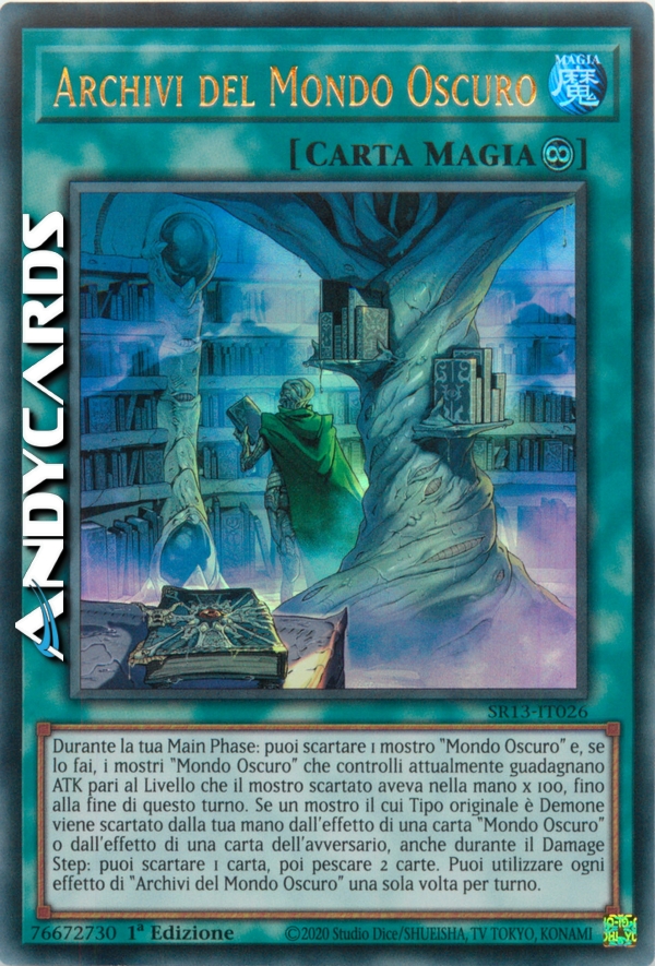 Durante la tua Main Phase: puoi scartare 1 mostro "Mondo Oscuro" e, se lo fai, i mostri "Mondo Oscuro" che controlli attualmente guadagnano ATK pari al Livello che il mostro scartato aveva nella mano x 100, fino alla fine di questo turno. Se un mostro il cui Tipo originale è Demone viene scartato dalla tua mano dall'effetto di una carta "Mondo Oscuro" o dall'effetto di una carta dell'avversario, anche durante il Damage Step: puoi scartare 1 carta, poi pescare 2 carte. Puoi utilizzare ogni effetto di "Archivi del Mondo Oscuro" una sola volta per turno.
