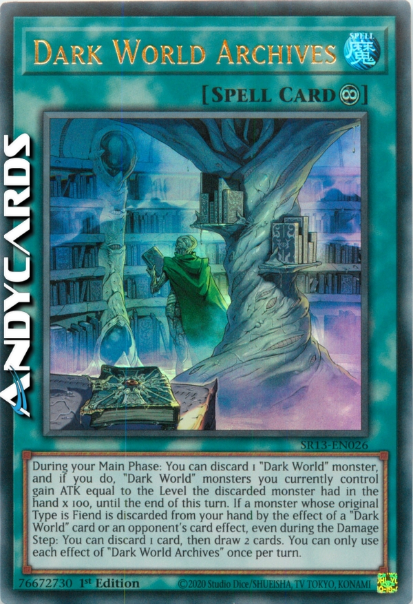 During your Main Phase: You can discard 1 "Dark World" monster, and if you do, "Dark World" monsters you currently control gain ATK equal to the Level the discarded monster had in the hand x 100, until the end of this turn. If a monster whose original Type is Fiend is discarded from your hand by the effect of a "Dark World" card or an opponent's card effect, even during the Damage Step: You can discard 1 card, then draw 2 cards. You can only use each effect of "Dark World Archives" once per turn.