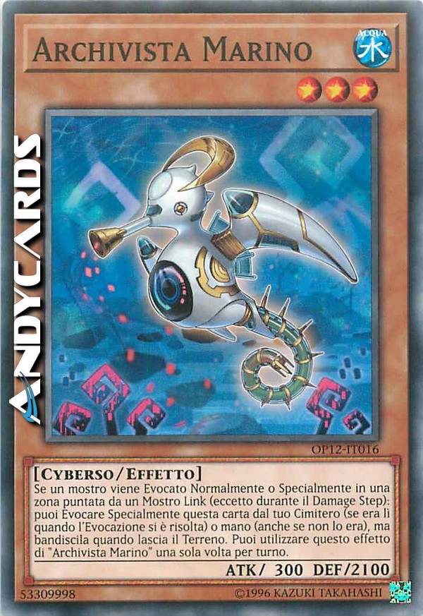 Se un mostro viene Evocato Normalmente o Specialmente in una zona puntata da un Mostro Link (eccetto durante il Damage Step): puoi Evocare Specialmente questa carta dal tuo Cimitero (se era lì quando l'Evocazione si è risolta) o mano (anche se non lo era), ma bandiscila quando lascia il Terreno. Puoi utilizzare questo effetto di "Archivista Marino" una sola volta per turno.