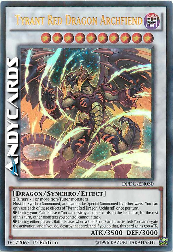 Must be Synchro Summoned, and cannot be Special Summoned by other ways. You can only use each of these effects of "Tyrant Red Dragon Archfiend" once per turn.