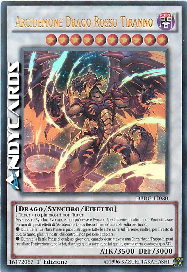 2 Tuner + 1 o più mostri non-Tuner - Deve essere Synchro Evocato, e non può essere Evocato Specialmente in altri modi. Puoi utilizzare ognuno di questi effetti di "Arcidemone Drago Rosso Tiranno" una sola volta per turno. - Durante la tua Main Phase 1: puoi distruggere tutte le altre carte sul Terreno, inoltre, per il resto di questo turno, gli altri mostri che controlli non possono attaccare. - Durante la Battle Phase di qualsiasi giocatore, quando viene attivata una Carta Magia/Trappola: puoi annullare l'attivazione e, se lo fai, distruggi quella carta e, se fai quello, questa carta guadagna 500 ATK.
