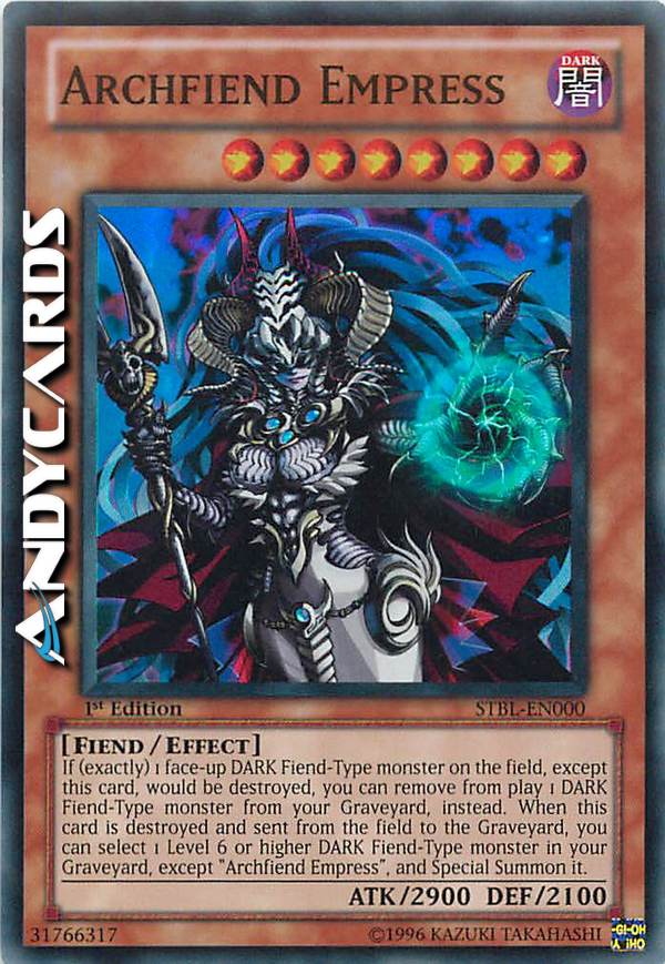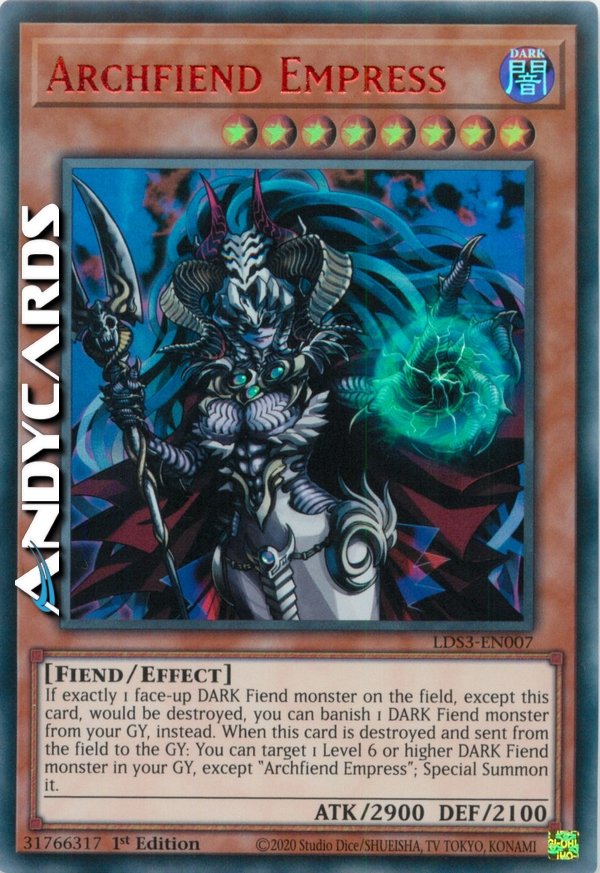 If (exactly) 1 face-up DARK Fiend-Type monster on the field, except this card, would be destroyed, you can remove from play 1 DARK Fiend-Type monster from your Graveyard, instead. When this card is destroyed and sent from the field to the Graveyard, you can select 1 Level 6 or higher DARK Fiend-Type monster in your Graveyard, except "Archfiend Empress", and Special Summon it.