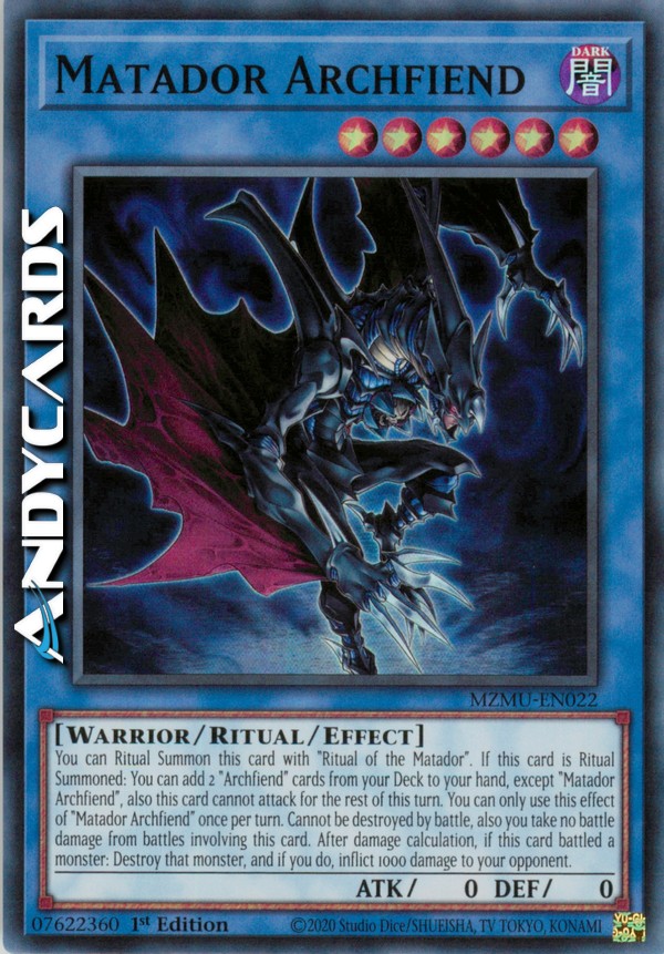 You can Ritual Summon this card with "Ritual of the Matador". If this card is Ritual Summoned: You can add 2 "Archfiend" cards from your Deck to your hand, except "Matador Archfiend", also this card cannot attack for the rest of this turn. You can only use this effect of "Matador Archfiend" once per turn. Cannot be destroyed by battle, also you take no battle damage from battles involving this card. After damage calculation, if this card battled a monster: Destroy that monster, and if you do, inflict 1000 damage to your opponent.