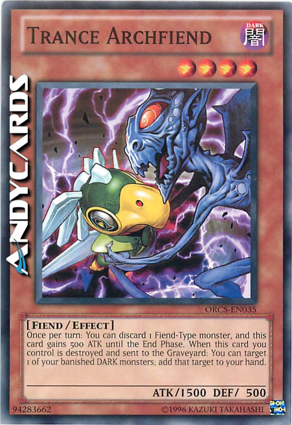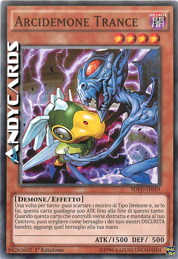 Una volta per turno: puoi scartare 1 mostro di Tipo Demone, e questa carta guadagna 500 ATK fino alla End Phase. Quando questa carta che controlli viene distrutta e mandata al Cimitero: puoi scegliere come bersaglio 1 dei tuoi mostri OSCURITÀ banditi; aggiungi quel bersaglio alla tua mano.