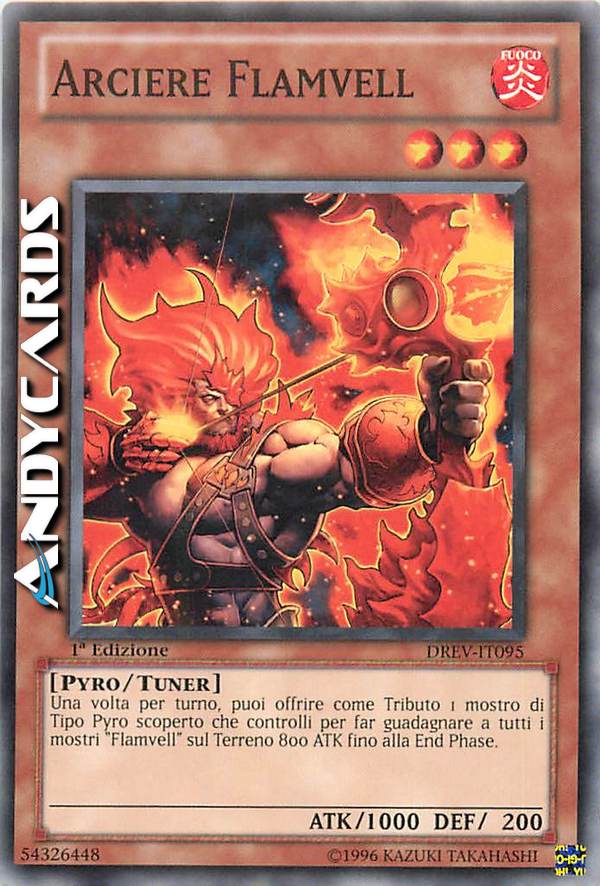 Una volta per turno,puoi offrire come tributo 1 mostro di tipo pyro scoperto che controlli per far guadagnare a tutti i mostri"flamvell"sul terreno 800 ATK fino alla end phase.