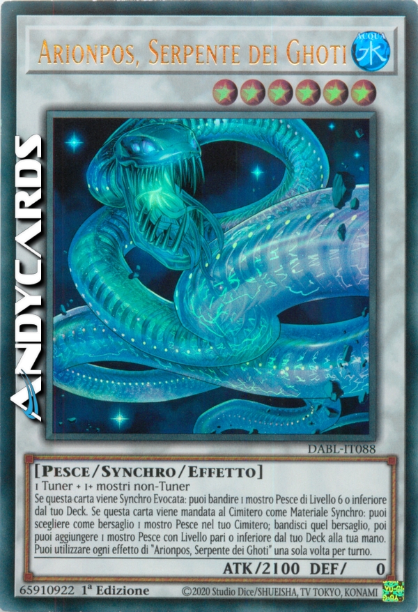 Se questa carta viene Synchro Evocata: puoi bandire 1 mostro Pesce di Livello 6 o inferiore dal tuo Deck. Se questa carta viene mandata al Cimitero come Materiale Synchro: puoi scegliere come bersaglio 1 mostro Pesce nel tuo Cimitero; bandisci quel bersaglio, poi puoi aggiungere 1 mostro Pesce con Livello pari o inferiore dal tuo Deck alla tua mano. Puoi utilizzare ogni effetto di "Arionpos, Serpente dei Ghoti" una sola volta per turno.
