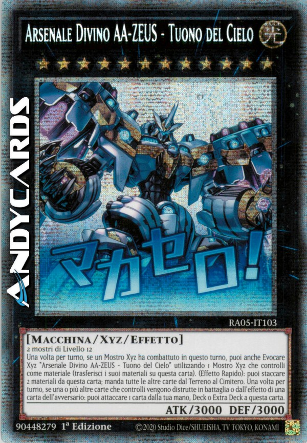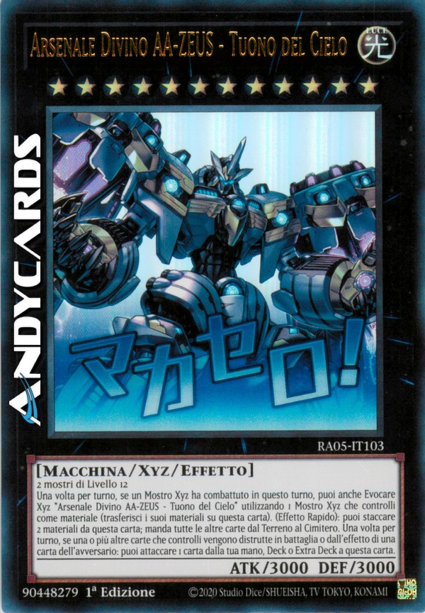 Una volta per turno, se un Mostro Xyz ha combattuto in questo turno, puoi anche Evocare Xyz "Arsenale Divino AA-ZEUS - Tuono del Cielo" utilizzando 1 Mostro Xyz che controlli come materiale. (Trasferisci i suoi materiali su questa carta.) (Effetto Rapido): puoi staccare 2 materiali da questa carta; manda tutte le altre carte dal Terreno al Cimitero. Una volta per turno, se una o più altre carte che controlli vengono distrutte in battaglia o dall'effetto di una carta dell'avversario: puoi attaccare 1 carta dalla tua mano, Deck o Extra Deck a questa carta come materiale.