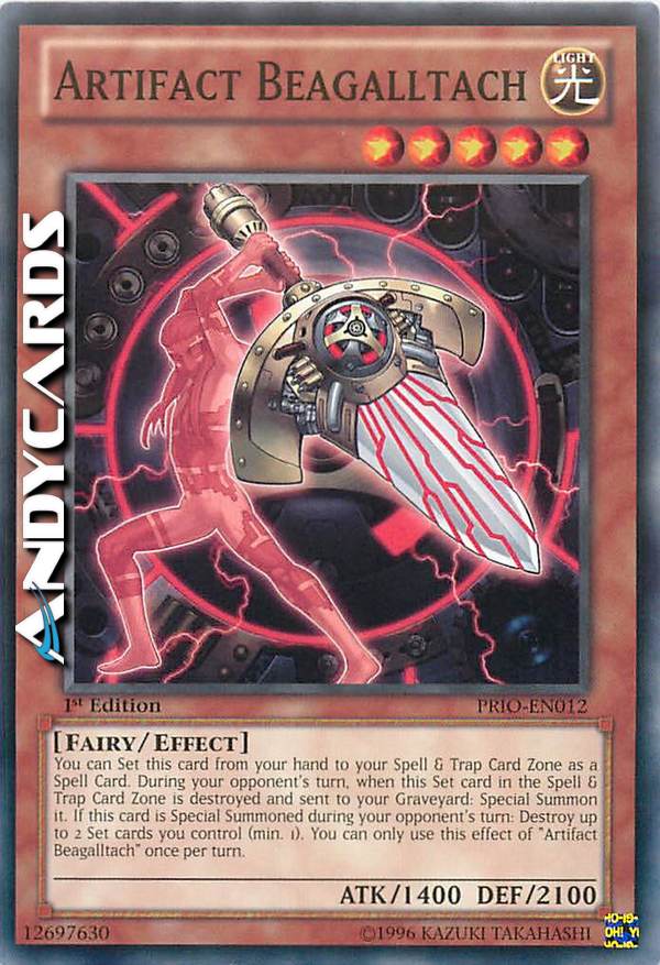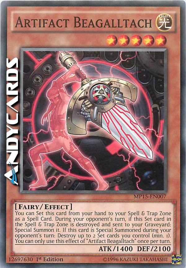 You can Set this card from your hand to your Spell & Trap Card Zone as a Spell Card. During your opponent's turn, when this Set card in the Spell & Trap Card Zone is destroyed and sent to your Graveyard: Special Summon it. If this card is Special Summoned during your opponent's turn: Destroy up to 2 Set cards you control (min. 1). You can only use this effect of "Artifact Beagalltach" once per turn.