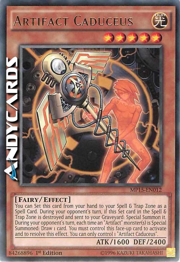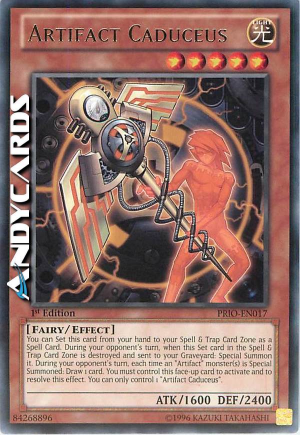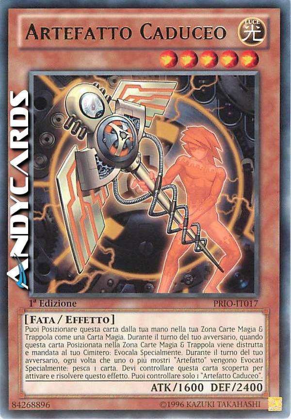 Puoi posizionare questa carta dalla tua mano nella tua Zona Carte Magia & Trappola come una Carte Magia. Durante il turno del tuo avversario, quando questa carta Posizionata nella Zona Carte Magia & Trappola viene distrutta e mandata al tuo cimitero: Evocala Specialmente. Durante il turno del tuo avversario quando uno o più mostri "Artefatto" vengono Evocati Specialmente: pesca 1 carta. Devi controllare questa carta scoperta per attivare e risolvere questo effetto. Puoi controllare solo 1 "Artefatto - Caduceo".
