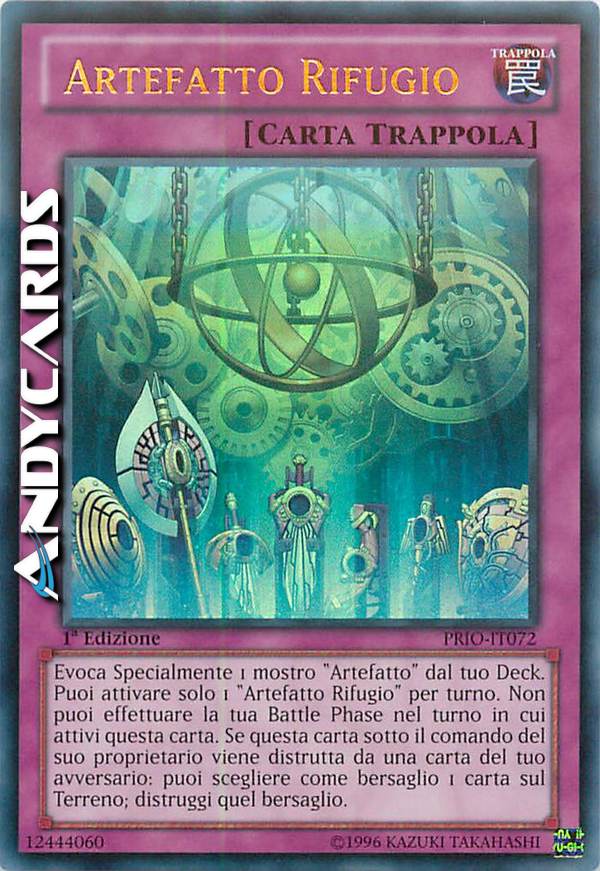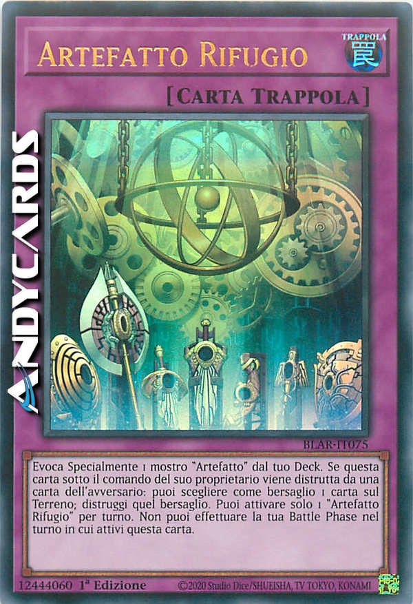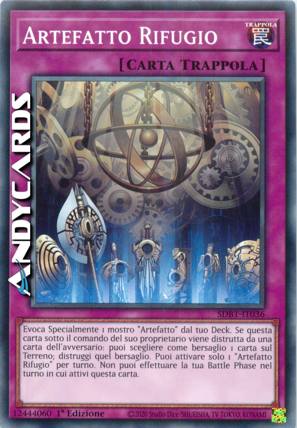 Evoca Specialmente 1 mostro "Artefatto" dal tuo Deck. Puoi attivare solo 1 "Artefatto Rifugio" per turno. Non puoi effettuare la tua Battle Phase nel turno in cui attivi questa carta. Se questa carta sotto il comando del suo proprietario viene distrutta da una carta del tuo avversario: puoi scegliere come bersaglio 1 carta sul Terreno; distruggi quel bersaglio.