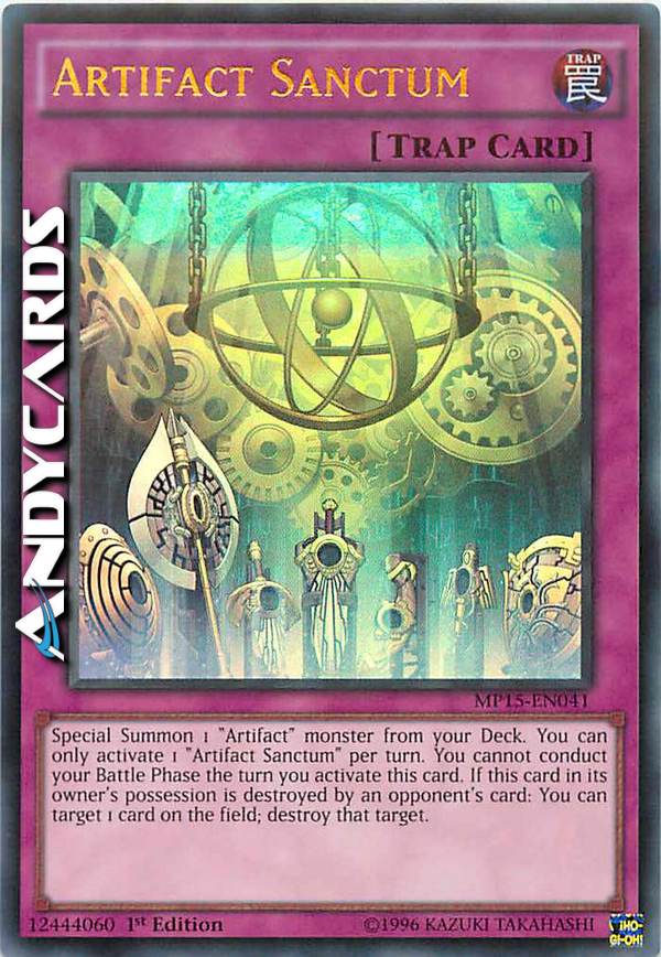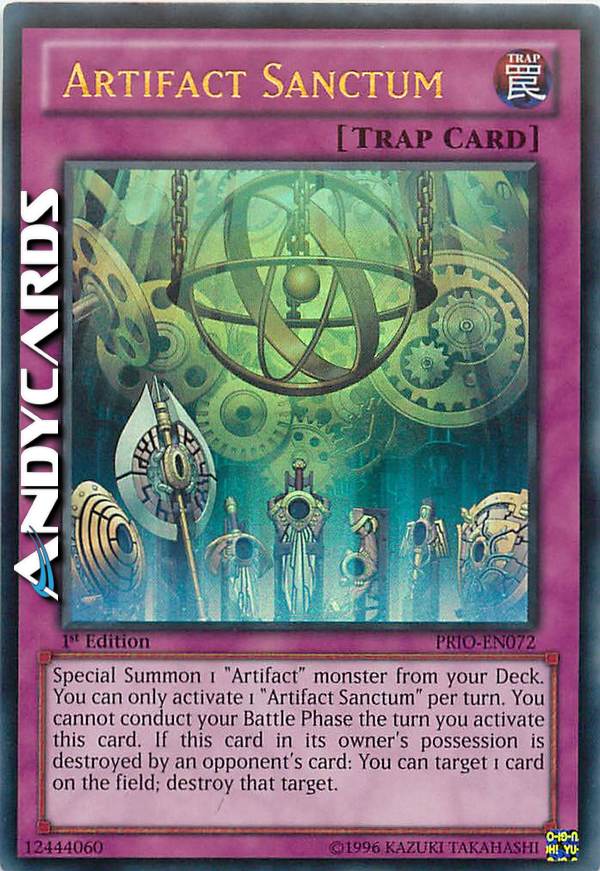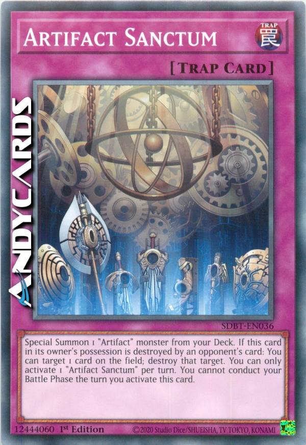 Special Summon 1 "Artifact" monster from your Deck. You can only activate 1 "Artifact Sanctum" per turn. You cannot conduct your Battle Phase the turn you activate this card. If this card in its owner's possession is destroyed by an opponent's card: You can target 1 card on the field; destroy that target.