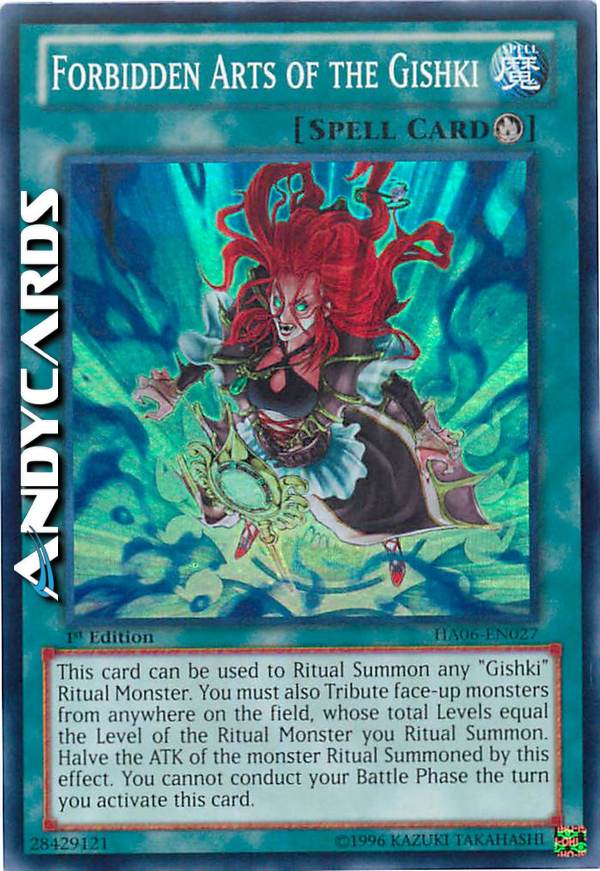This card can be used to Ritual Summon any "Gishki" Ritual Monster. You must also Tribute face-up monsters from anywhere on the field, whose total Levels equal the Level of the Ritual Monster you Ritual Summon. Halve the ATK of the monster Ritual Summoned by this effect. You cannot conduct your Battle Phase the turn you activate this card.