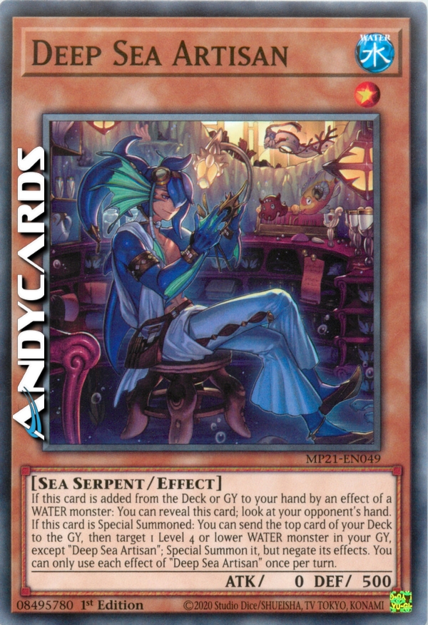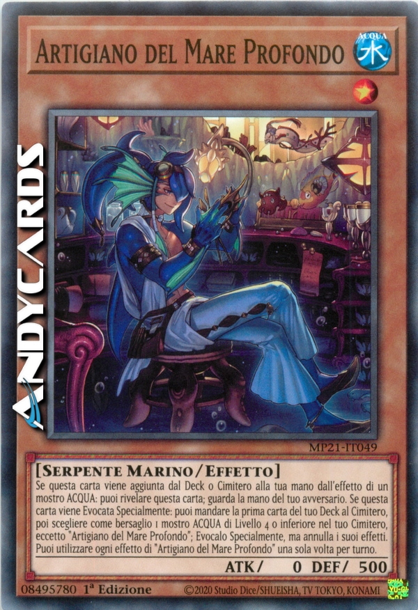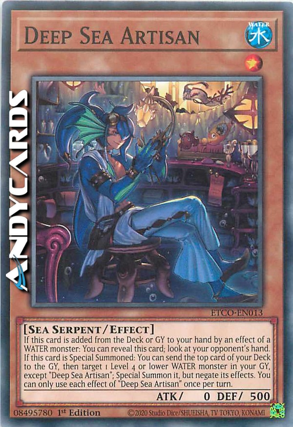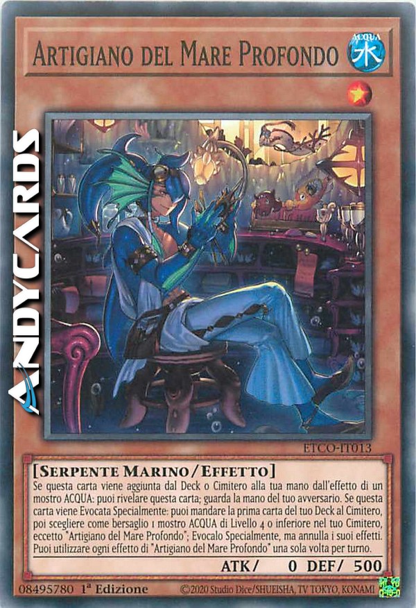 Se questa carta viene aggiunta dal Deck o Cimitero alla tua mano dall'effetto di un mostro ACQUA: puoi rivelare questa carta; guarda la mano del tuo avversario. Se questa carta viene Evocata Specialmente: puoi mandare la prima carta del tuo Deck al Cimitero, poi scegliere come bersaglio 1 mostro ACQUA di Livello 4 o inferiore nel tuo Cimitero, eccetto "Artigiano del Mare Profondo"; Evocalo Specialmente, ma annulla i suoi effetti. Puoi utilizzare ogni effetto di "Artigiano del Mare Profondo" una sola volta per turno.