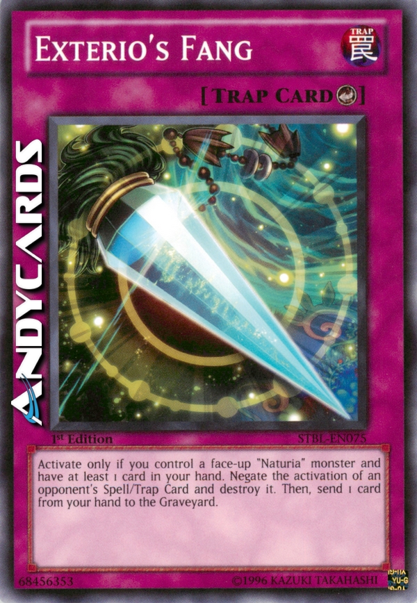 Attiva solo se controlli un mostro "Naturia" scoperto e hai almeno 1 carta in mano. Annulla l'attivazione di una Carta Magia/Trappola dell'avversario e distruggila. Poi, manda 1 carta dalla tua mano al Cimitero.