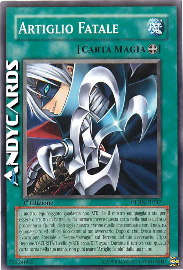 Il mostro equipaggiato guadagna 300 ATK, Se il mostro equipaggiato sta per essere distrutto in battaglia, fai tornare invece questa carta nella mano del suo proprietario. Quindi, distruggi 1 mostro, tranne quello che combatte con il mostro equipaggiato ed infliggi 600 danni al tuo avversario. Dopo di chè, Evoca tramite Evocazione Speciale 1 "Segna-Malvagio" sul Terreno del tuo avversario. (Tipo Demone/OSCURITA'/Livello 7/ATK 2500/DEF 2500). Durante il turno in cui questa carta torna nella tua mano, non puoi usare "Artiglio Fatale" dalla tua mano.