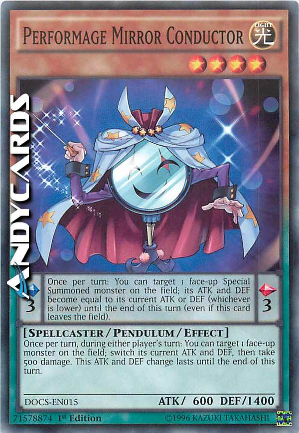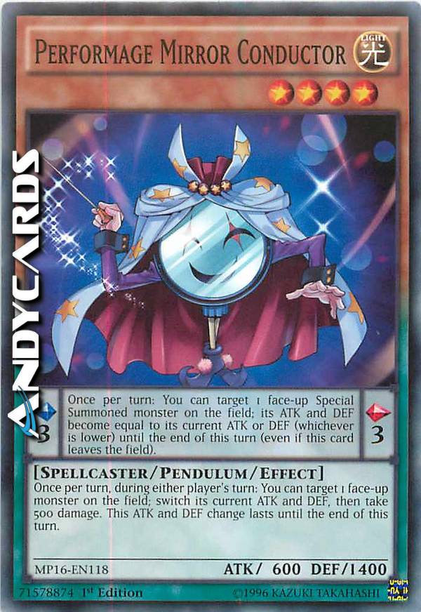 Una volta per turno, durante il turno di qualsiasi giocatore: puoi scegliere come bersaglio 1 mostro scoperto sul Terreno; scambia i suoi ATK e DEF attuali, poi subisci 500 danni. Questo cambio di ATK e DEF dura fino alla fine di questo turno.  Effetto Pendulum: Una volta per turno: puoi scegliere come bersaglio 1 mostro scoperto Evocato Specialmente sul Terreno; i suoi ATK e DEF diventano pari al suo ATK o DEF attuale (il più basso dei due) fino alla fine di questo turno (anche se questa carta lascia il Terreno).