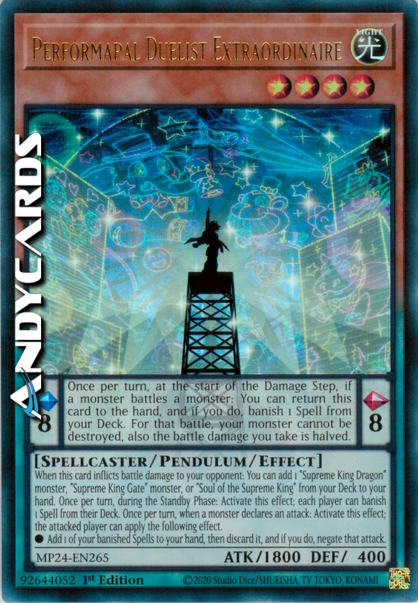 Effetto Pendulum: Quando questa carta infligge danno da combattimento al tuo avversario: puoi aggiungere 1 mostro "Re Supremo Drago", mostro "Re Supremo Cancello" o "Anima del Re Supremo" dal tuo Deck alla tua mano. Una volta per turno, durante la Standby Phase: attiva questo effetto; ogni giocatore può bandire 1 Magia dal suo Deck. Una volta per turno, quando un mostro dichiara un attacco: attiva questo effetto; il giocatore attaccato può applicare il seguente effetto.