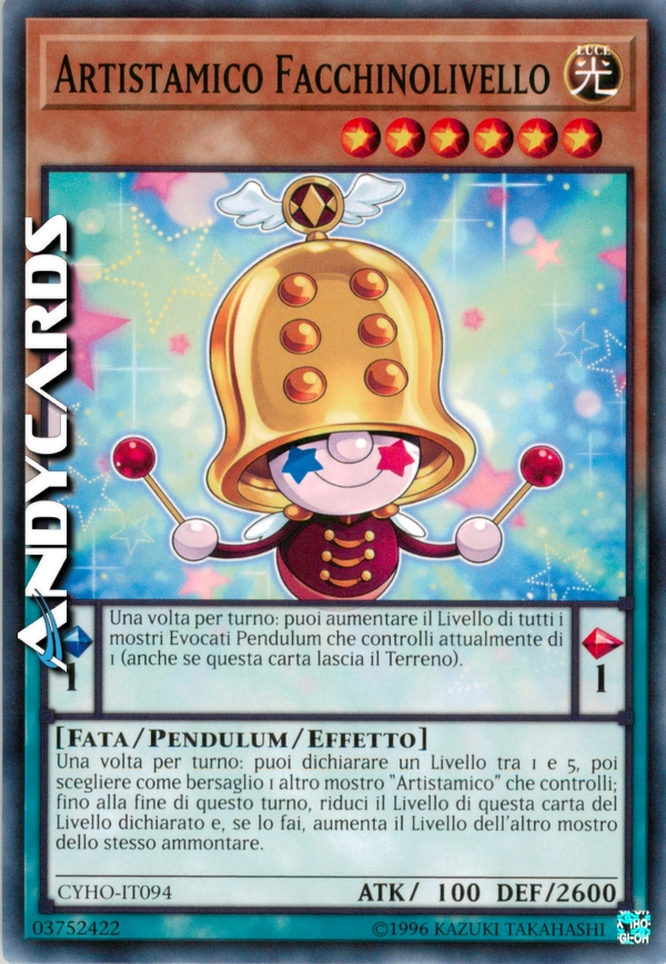 Una volta per turno: puoi dichiarare un Livello tra 1 e 5, poi scegliere come bersaglio 1 altro mostro "Artistamico" che controlli; fino alla fine di questo turno, riduci il Livello di questa carta del Livello dichiarato e, se lo fai, aumenta il Livello dell'altro mostro dello stesso ammontare.