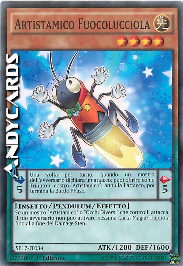 Se un mostro "Artistamico" o "Occhi Diversi" che controlli attacca, il tuo avversario non può attivare nessuna Carta Magia/Trappola fino alla fine del Damage Step. - Una volta per turno, quando un mostro dell'avversario dichiara un attacco: puoi offrire come Tributo 1 mostro "Artistamico"; annulla l'attacco, poi termina la Battle Phase.