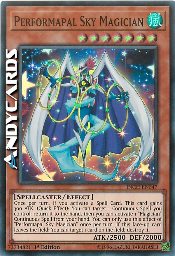 Once per turn, if you activate a Spell Card: This card gains 300 ATK. During either player's turn: You can target 1 Continuous Spell Card you control; return it to the hand, then you can activate 1 "Magician" Continuous Spell Card from your hand. You can only use this effect of "Performapal Sky Magician" once per turn. If this face-up card leaves the field: You can target 1 card on the field; destroy it.