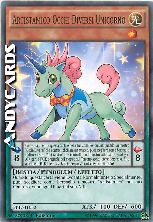 Quando questa carta viene Evocata Normalmente o Specialmente: puoi scegliere come bersaglio 1 mostro "Artistamico" nel tuo Cimitero; guadagni LP pari al suo ATK. - Una volta, mentre questa carta è nella tua Zona Pendulum, quando un mostro "Occhi Diversi" che controlli dichiara un attacco: puoi scegliere come bersaglio 1 altro mostro "Artistamico" che controlli; quel mostro attaccante guadagna ATK pari all'ATK originale del mostro sul Terreno scelto come bersaglio, fino alla fine della Battle Phase (anche se questa carta lascia il Terreno).