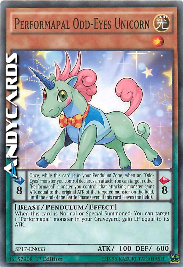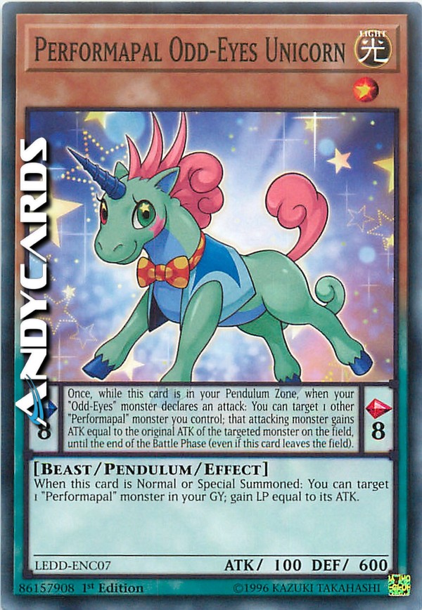 When this card is Normal or Special Summoned: You can target 1 "Performapal" monster in your Graveyard; gain LP equal to its ATK. - Once, while this card is in your Pendulum Zone, when an "Odd-Eyes" monster you control declares an attack: You can target 1 other "Performapal" monster you control; that attacking monster gains ATK equal to the original ATK of the targeted monster on the field, until the end of the Battle Phase (even if this cardleaves the field).