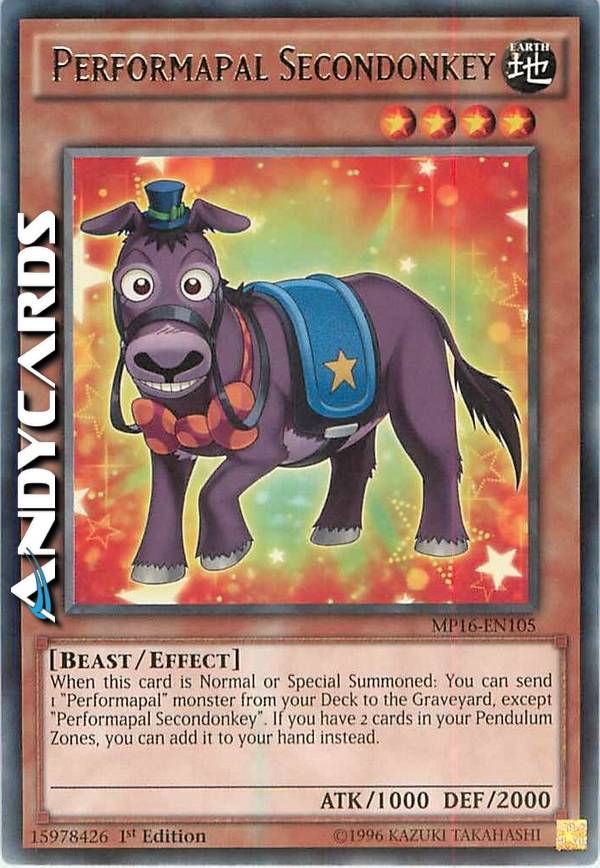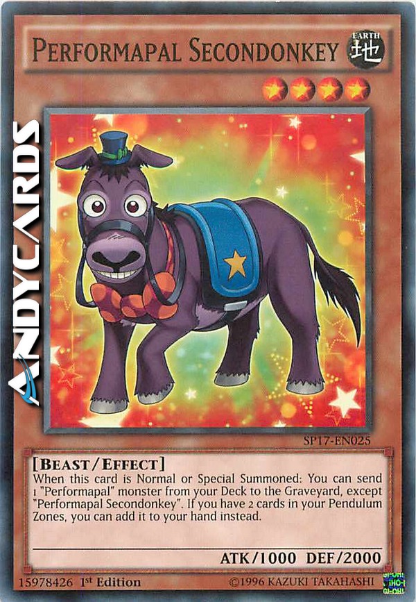 When this card is Normal or Special Summoned: You can send 1 "Performapal" monster from your Deck to the Graveyard, except "Performapal Secondonkey". If you have 2 cards in your Pendulum Zones, you can add it to your hand instead.