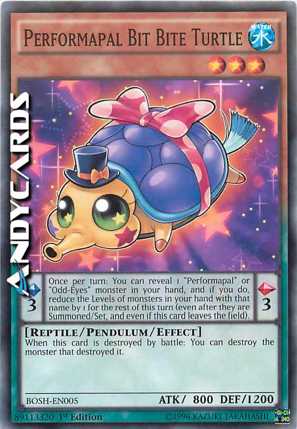 When this card is destroyed by battle: You can destroy the monster that destroyed it. Pendulum Effect: Once per turn: You can reveal 1 "Performapal" or "Odd-Eyes" monster in your hand, and if you do, reduce the Levels of monsters in your hand with that name by 1 for the rest of this turn (even after they are Summoned/Set, and even if this card leaves the field).