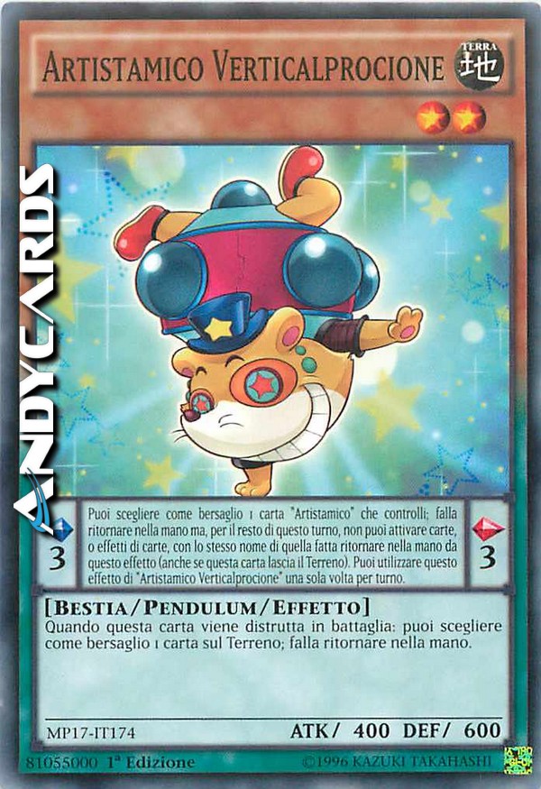 Puoi scegliere come bersaglio 1 carta "Artistamico" che controlli; falla ritornare nella mano ma, per il resto di questo turno, non puoi attivare carte, o effetti di carte, con lo stesso nome di quella fatta ritornare nella mano da questo effetto (anche se questa carta lascia il Terreno). Puoi utilizzare questo effetto di "Artistamico Verticalprocione" una sola volta per turno. - Quando questa carta viene distrutta in battaglia: puoi scegliere come bersaglio 1 carta sul Terreno; falla ritornare nella mano.
