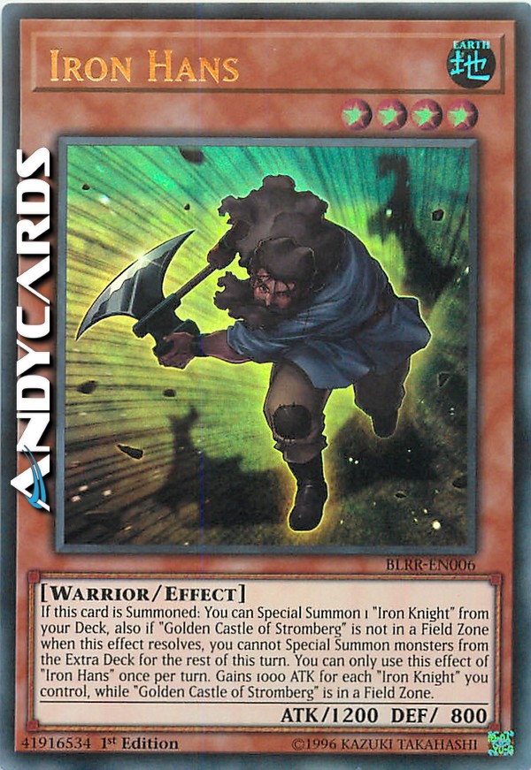 If this card is Summoned: You can Special Summon 1 "Iron Knight" from your Deck, also if "Golden Castle of Stromberg" is not in a Field Zone when this effect resolves, you cannot Special Summon monsters from the Extra Deck for the rest of this turn. You can only use this effect of "Iron Hans" once per turn. Gains 1000 ATK for each "Iron Knight" you control, while "Golden Castle of Stromberg" is in a Field Zone.