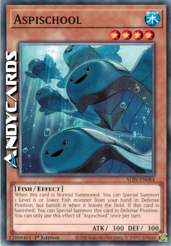 When this card is Normal Summoned: You can Special Summon 1 Level 6 or lower Fish monster from your hand in Defense Position, but banish it when it leaves the field. If this card is banished: You can Special Summon this card in Defense Position. You can only use this effect of "Aspischool" once per turn.