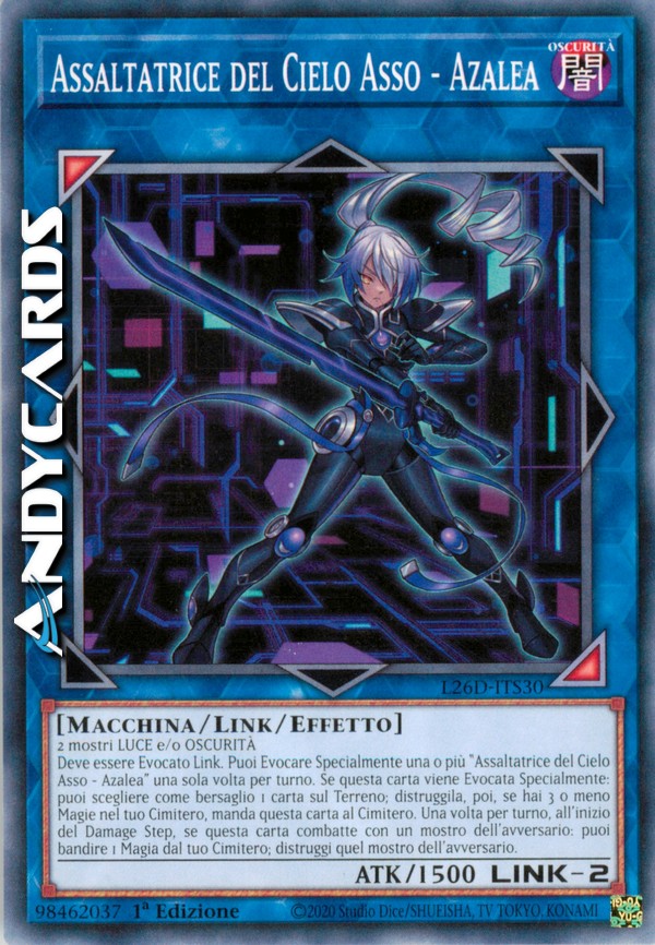 Deve essere Evocato Link. Puoi Evocare Specialmente una o più "Assaltatrice del Cielo Asso - Azalea" una sola volta per turno. Se questa carta viene Evocata Specialmente: puoi scegliere come bersaglio 1 carta sul Terreno; distruggila, poi, se hai 3 o meno Magie nel tuo Cimitero, manda questa carta al Cimitero. Una volta per turno, all'inizio del Damage Step, se questa carta combatte con un mostro dell'avversario: puoi bandire 1 Magia dal tuo Cimitero; distruggi quel mostro dell'avversario.