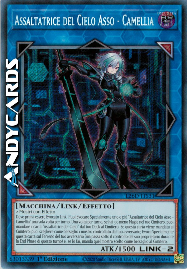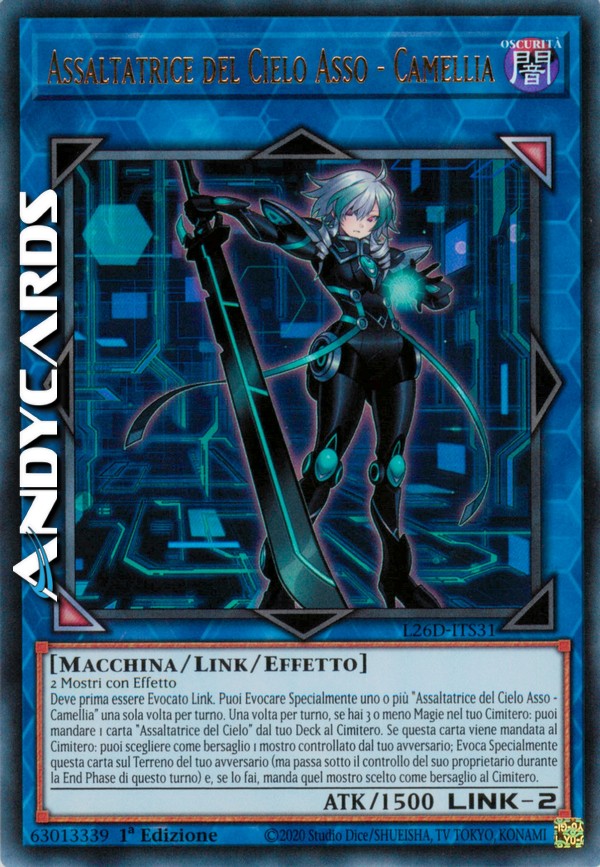 2 Mostri con Effetto Deve prima essere Evocato Link. Puoi Evocare Specialmente uno o più "Assaltatrice del Cielo Asso - Camellia" una sola volta per turno. Una volta per turno, se hai 3 o meno Magie nel tuo Cimitero: puoi mandare 1 carta "Assaltatrice del Cielo" dal tuo Deck al Cimitero. Se questa carta viene mandata al Cimitero: puoi scegliere come bersaglio 1 mostro controllato dal tuo avversario; Evoca Specialmente questa carta sul Terreno del tuo avversario (ma passa sotto il controllo del suo proprietario durante la End Phase di questo turno) e, se lo fai, manda quel mostro scelto come bersaglio al Cimitero.