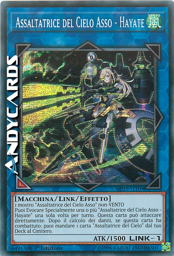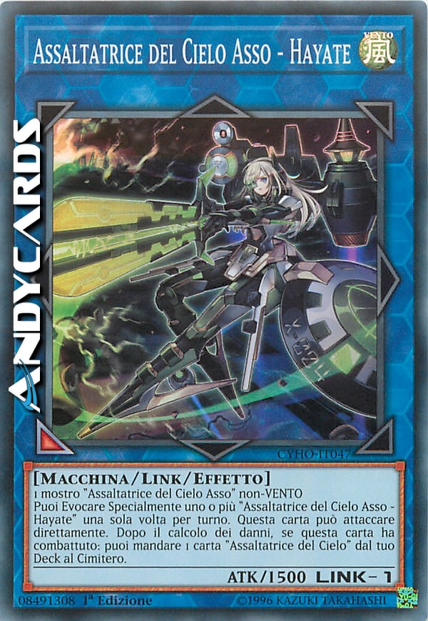 Puoi Evocare Specialmente una o più "Assaltatrice del Cielo Asso - Hayate" una sola volta per turno. Questa carta può attaccare direttamente. Dopo il calcolo dei danni, se questa carta ha combattuto: puoi mandare 1 carta "Assaltatrice del Cielo" dal tuo Deck al Cimitero.