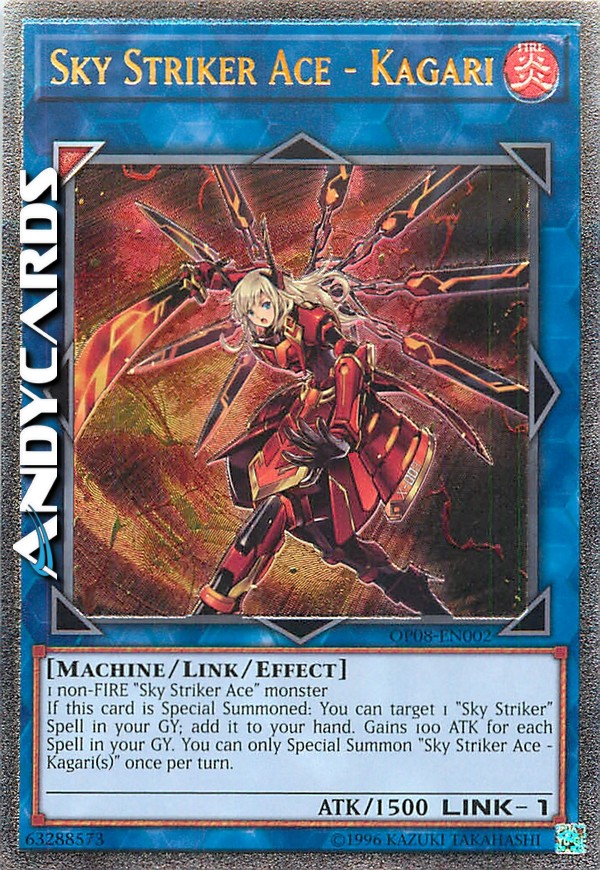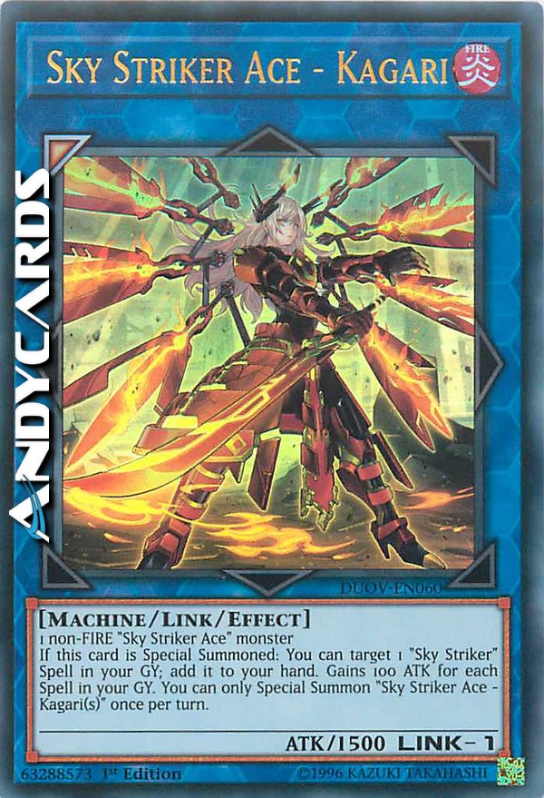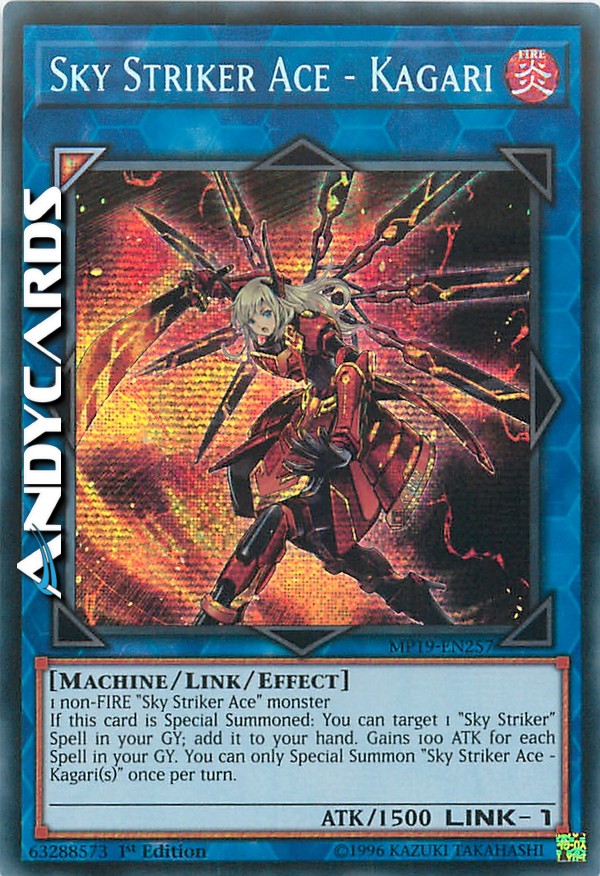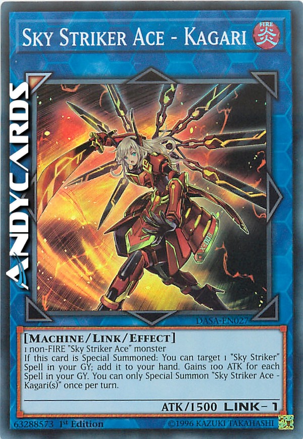 If this card is Special Summoned: You can target 1 "Sky Striker" Spell in your GY; add it to your hand. Gains 100 ATK for each Spell in your GY. You can only Special Summon "Sky Striker Ace - Kagari(s)" once per turn.