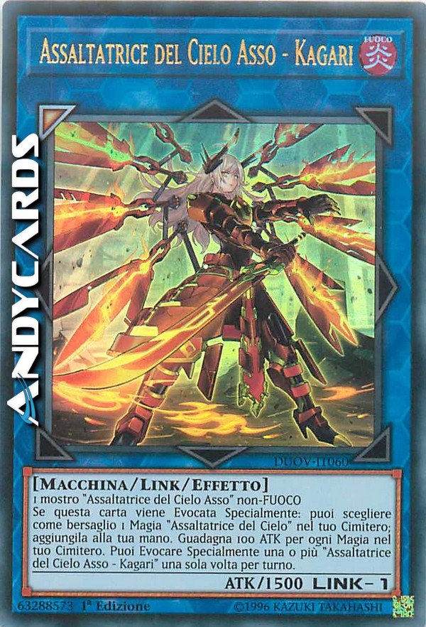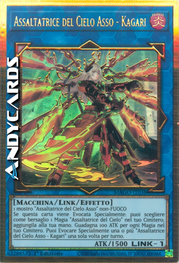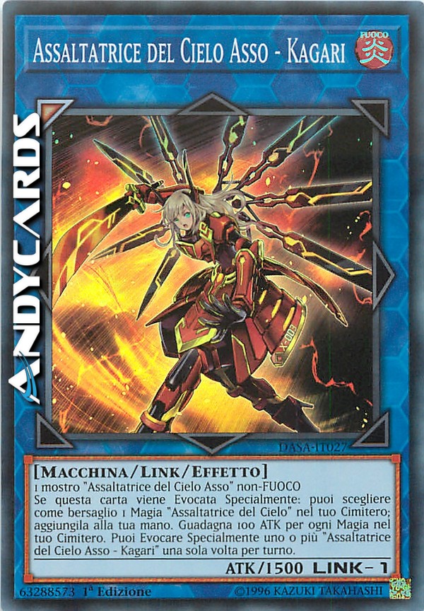 Se questa carta viene Evocata Specialmente: puoi scegliere come bersaglio 1 Magia "Assaltatrice del Cielo" nel tuo Cimitero; aggiungila alla tua mano. Guadagna 100 ATK per ogni Magia nel tuo Cimitero. Puoi Evocare Specialmente una o più "Assaltatrice del Cielo Asso - Kagari" una sola volta per turno.