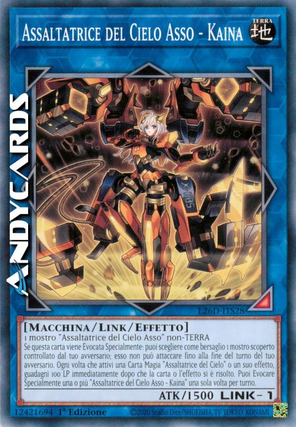 Se questa carta viene Evocata Specialmente: puoi scegliere come bersaglio 1 mostro scoperto controllato dal tuo avversario; esso non può attaccare fino alla fine del turno del tuo avversario. Ogni volta che attivi una Carta Magia "Assaltatrice del Cielo", o i suoi effetti, guadagni 100 LP immediatamente dopo che la carta o l'effetto si è risolto. Puoi Evocare Specialmente una o più "Assaltatrice del Cielo Asso - Kaina" una sola volta per turno.