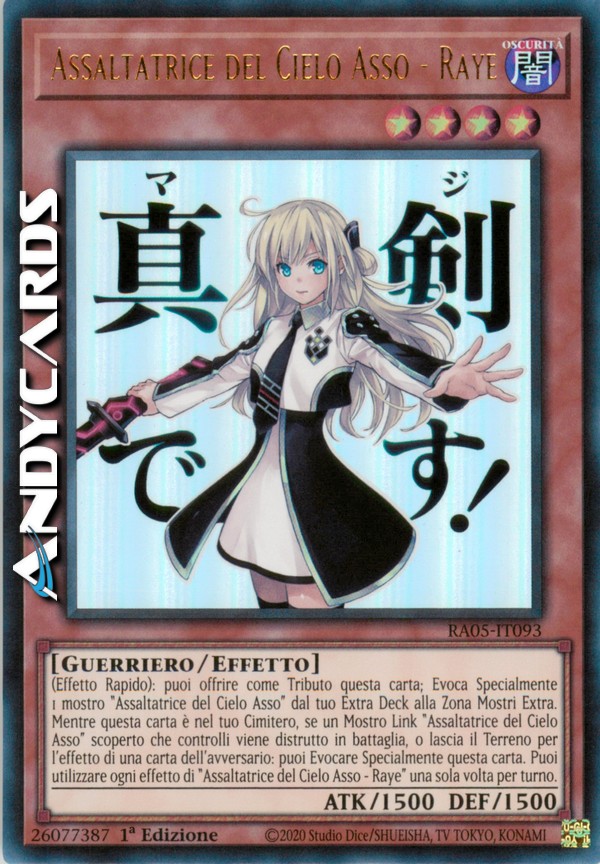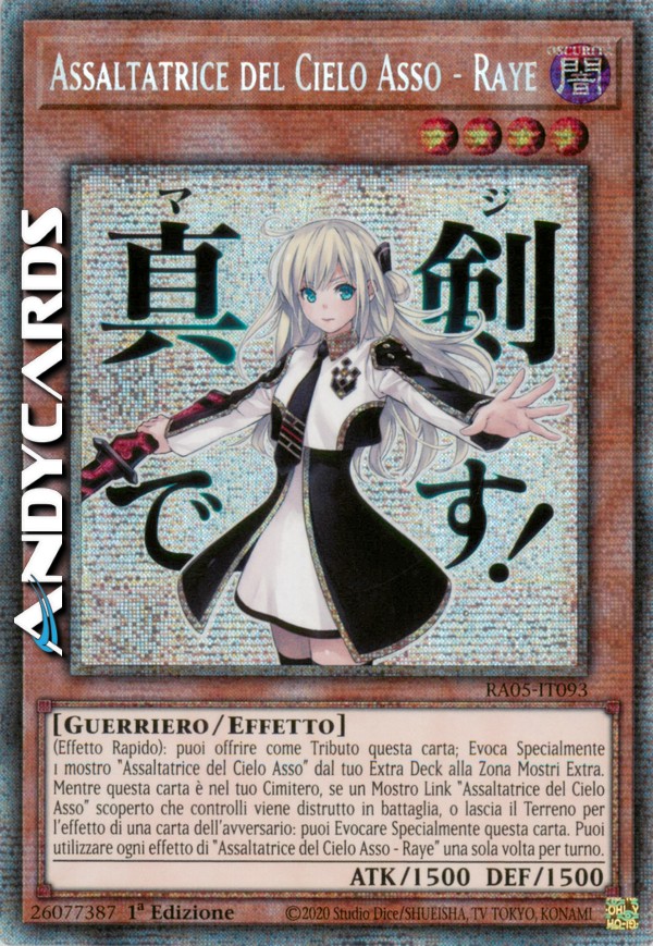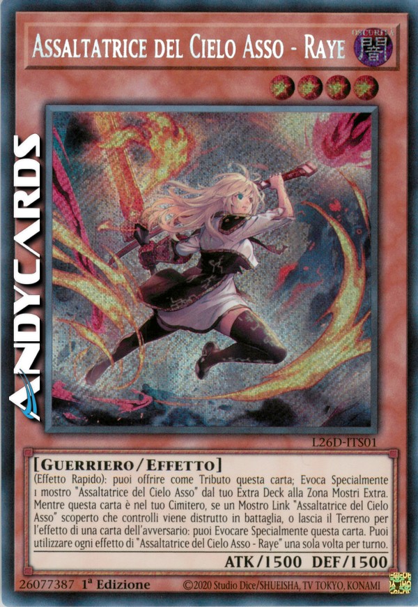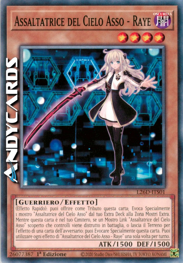 (Effetto Rapido): puoi offrire come Tributo questa carta; Evoca Specialmente 1 mostro "Assaltatrice del Cielo Asso" dal tuo Extra Deck alla Zona Mostri Extra. Mentre questa carta è nel tuo Cimitero, se un Mostro Link "Assaltatrice del Cielo Asso" scoperto che controlli viene distrutto in battaglia, o lascia il Terreno per l'effetto di una carta dell'avversario: puoi Evocare Specialmente questa carta. Puoi utilizzare ogni effetto di "Assaltatrice del Cielo Asso - Raye" una sola volta per turno.