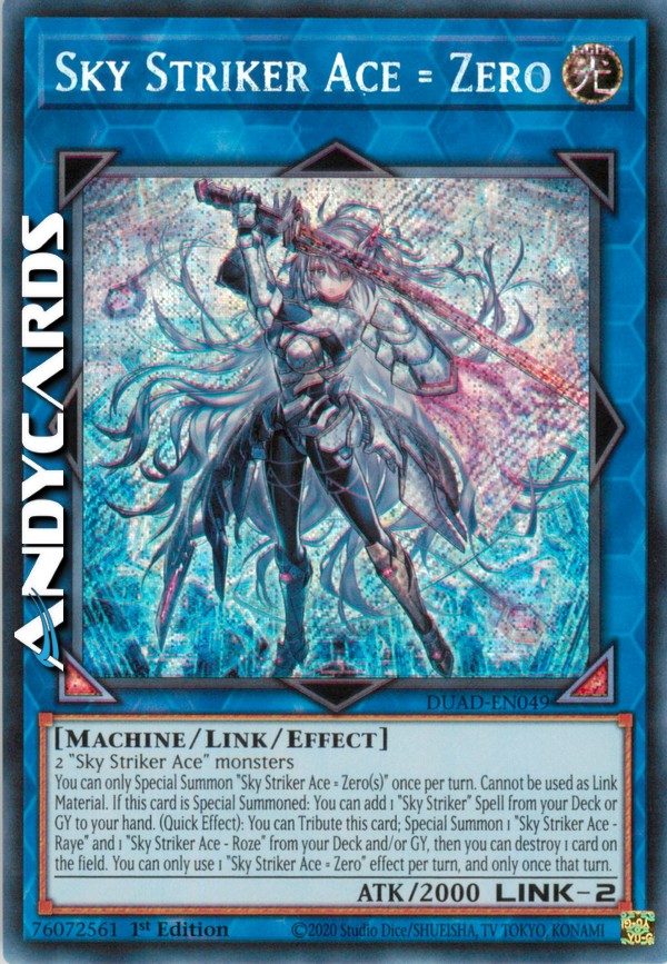 You can only Special Summon "Sky Striker Ace = Zero(s)" once per turn. Cannot be used as Link Material. If this card is Special Summoned: You can add 1 "Sky Striker" Spell from your Deck or GY to your hand. (Quick Effect): You can Tribute this card; Special Summon 1 "Sky Striker Ace - Raye" and 1 "Sky Striker Ace - Roze" from your Deck and/or GY, then you can destroy 1 card on the field. You can only use 1 "Sky Striker Ace = Zero" effect per turn, and only once that turn.