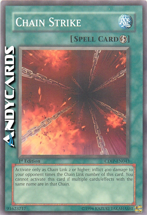 Attiva questa carta solo come Anello 2 o più di una Catena. Infliggi al tuo avversario 400 danni x il numero dell'Anello della Catena di questa carta. Non puoi attivare questa carta se più di una carta/effetto con lo stesso nome è stata attivata in quella catena.