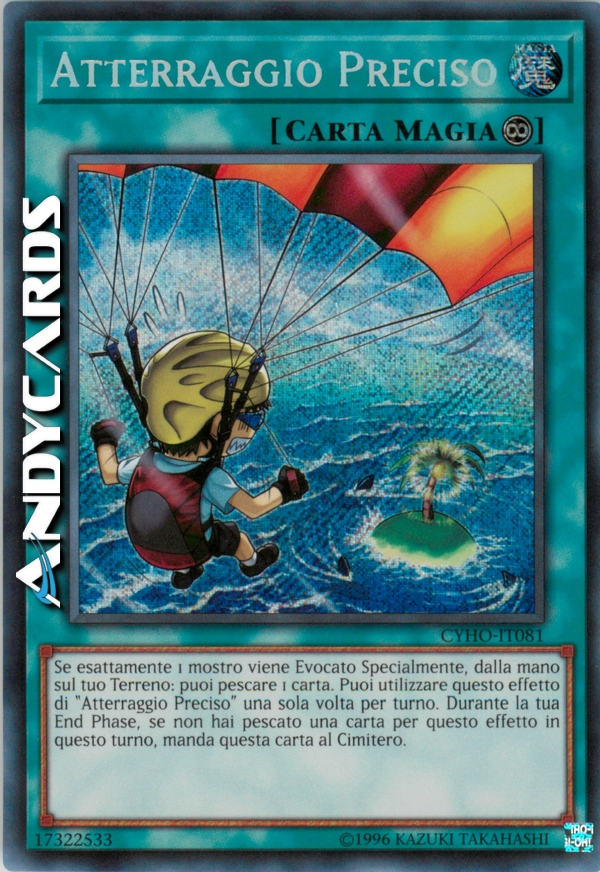 Se esattamente 1 mostro viene Evocato Specialmente, dalla mano sul tuo Terreno: puoi pescare 1 carta. Puoi utilizzare questo effetto di "Atterraggio Preciso" una sola volta per turno. Durante la tua End Phase, se non hai pescato una carta per questo effetto in questo turno, manda questa carta al Cimitero.