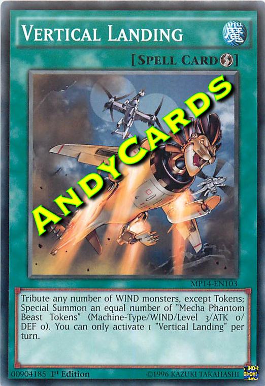 Tribute any number of WIND monsters, except Tokens; Special Summon an equal number of "Mecha Phantom Beast Tokens" (Machine-Type/WIND/Level 3/ATK 0/DEF 0). You can only activate 1 "Vertical Landing" per turn.