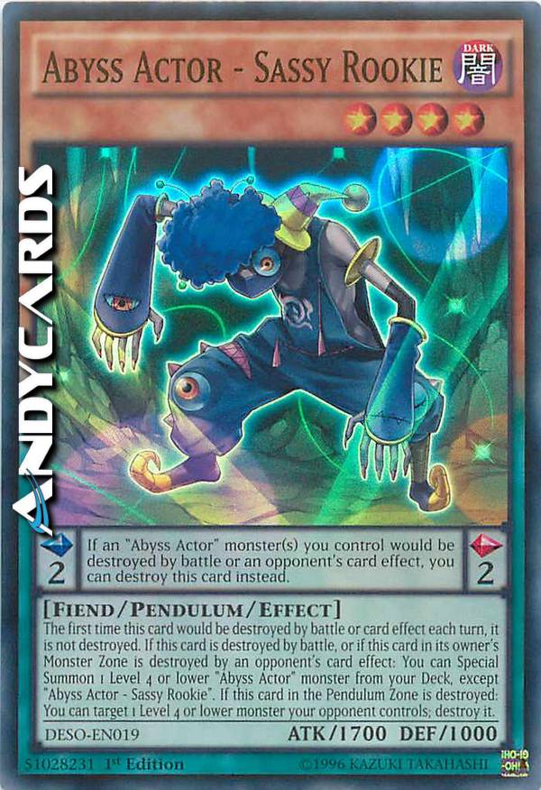 The first time this card would be destroyed by battle or card effect each turn, it is not destroyed. If this card is destroyed by battle, or if this card in its owner's Monster Zone is destroyed by an opponent's card effect: You can Special Summon 1 Level 4 or lower "Abyss Actor" monster from your Deck, except "Abyss Actor - Sassy Rookie". If this card in the Pendulum Zone is destroyed: You can target1 Level 4 or lower monster your opponent controls; destroy it. - Pendulum Effect: If an "Abyss Actor" monster(s) you control would be destroyed by battle or an opponent's card effect, you can destroy this card instead.