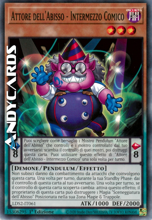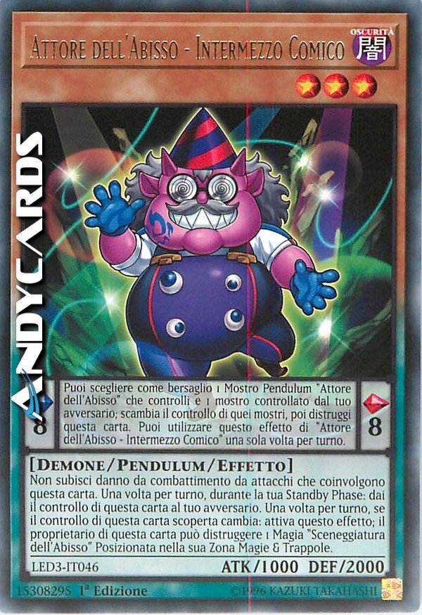 Effetto Pendulum: Puoi scegliere come bersaglio 1 Mostro Pendulum "Attore dell'Abisso" che controlli e 1 mostro controllato dal tuo avversario; scambia il controllo di quei mostri, poi distruggi questa carta. Puoi utilizzare questo effetto di "Attore dell'Abisso - Intermezzo Comico" una sola volta per turno.