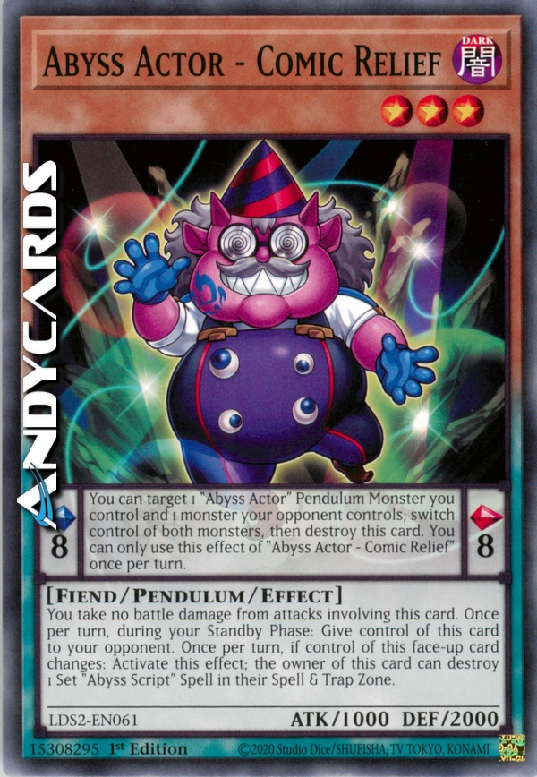 Pendulum Effect: You can target 1 "Abyss Actor" Pendulum Monster you control and 1 monster your opponent controls; switch control of both monsters, then destroy this card. You can only use this effect of "Abyss Actor - Comic Relief" once per turn.